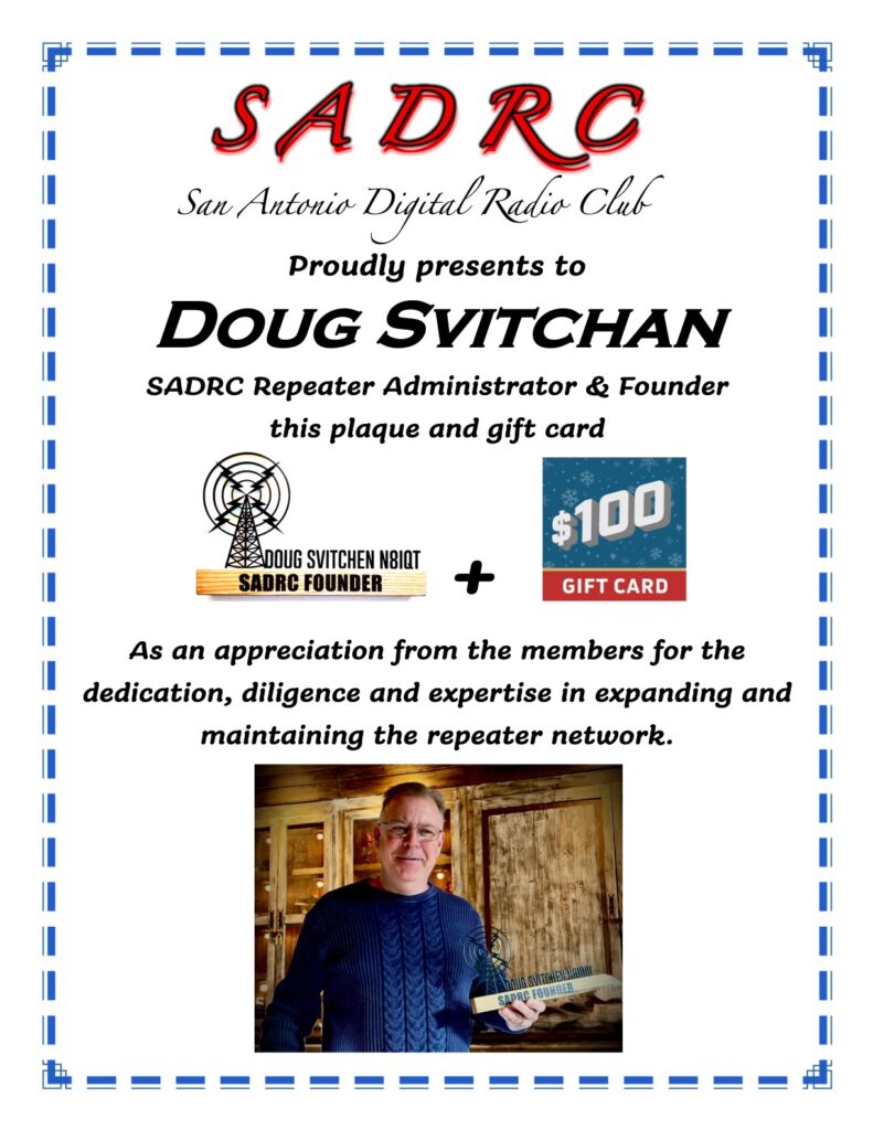 Doug, N8IQT was awarded at the Jan 17th club meeting both a placque and $100 gift card as an appreciation for the dedication, diligence and expertise in expanding the SADRC repeater network.
